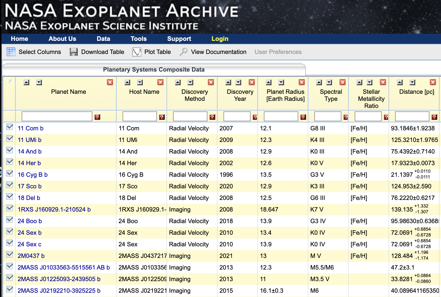 The Planetary Systems Composite Parameters Planet Data table (PSCompPars) is a compilation of system, stellar, and planetary parameters for known Confirmed Exoplanets. The purpose of this table is to enable a more statistical view of the known exoplanet population and their host environments.