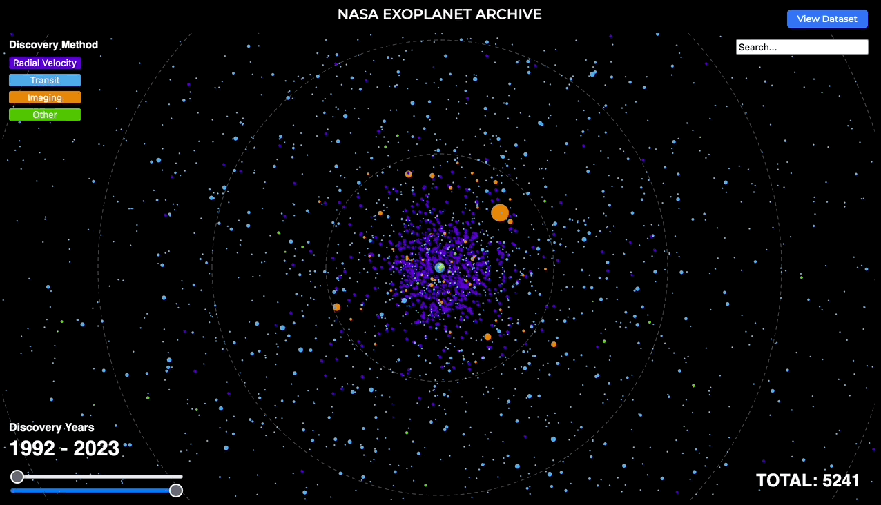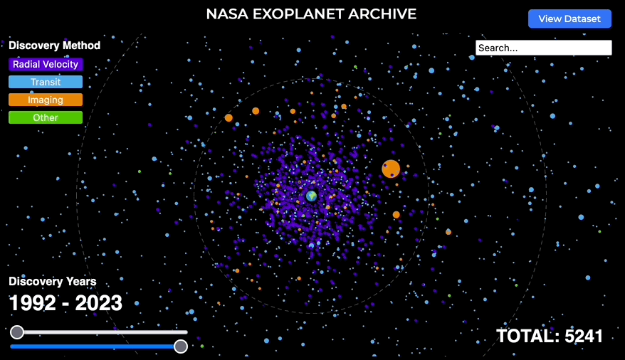 There are three main methods used for discovering exoplanets: Radial Velocity, Transit, & Imaging. Each discovery method has a colour associated with it to view in the visualization, there is also buttons in the top left corner to toggle the exoplanets found using that method on or off.