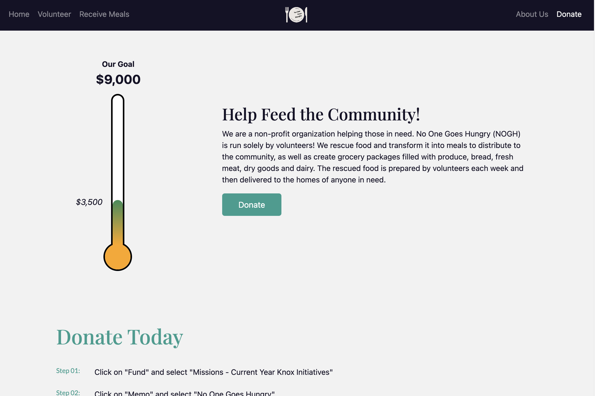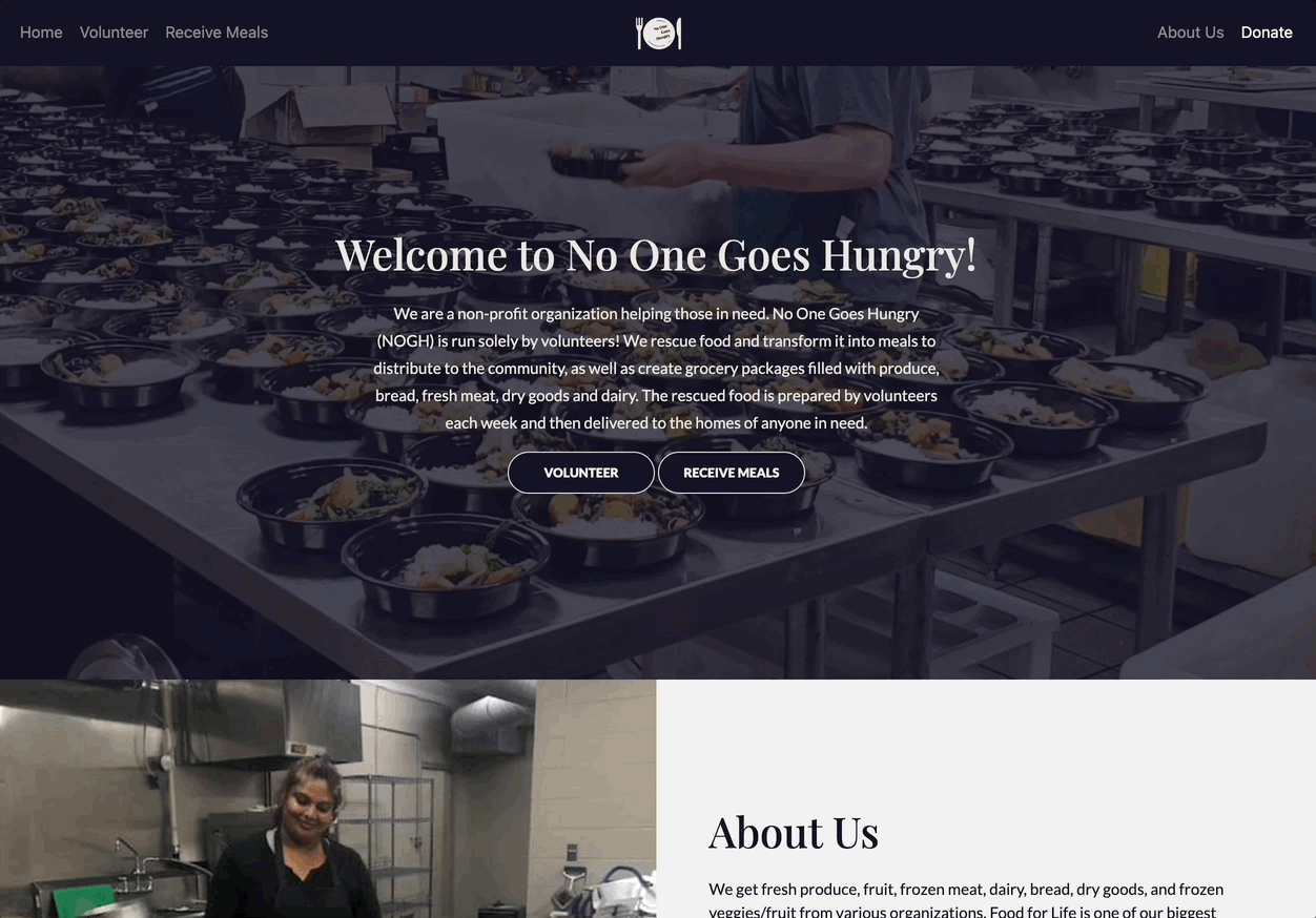 The websites home page will be used as a form of advertising for the organization. For new users who are unfamiliar with what the organization does the hero section displays a quick summary of what No One Goes Hungry offers.
