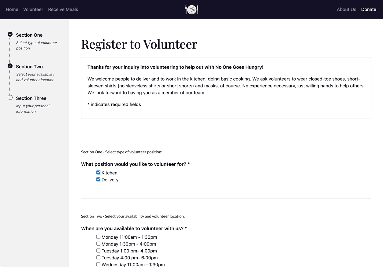 The main functionality the client requested was a website that would enable them to expand their operations. The custom volunteer registration form easily allows anyone in the community to register through the website. This registration form collects and validates the required information from users and shows their progress in the sidebar as the user fills out the form.