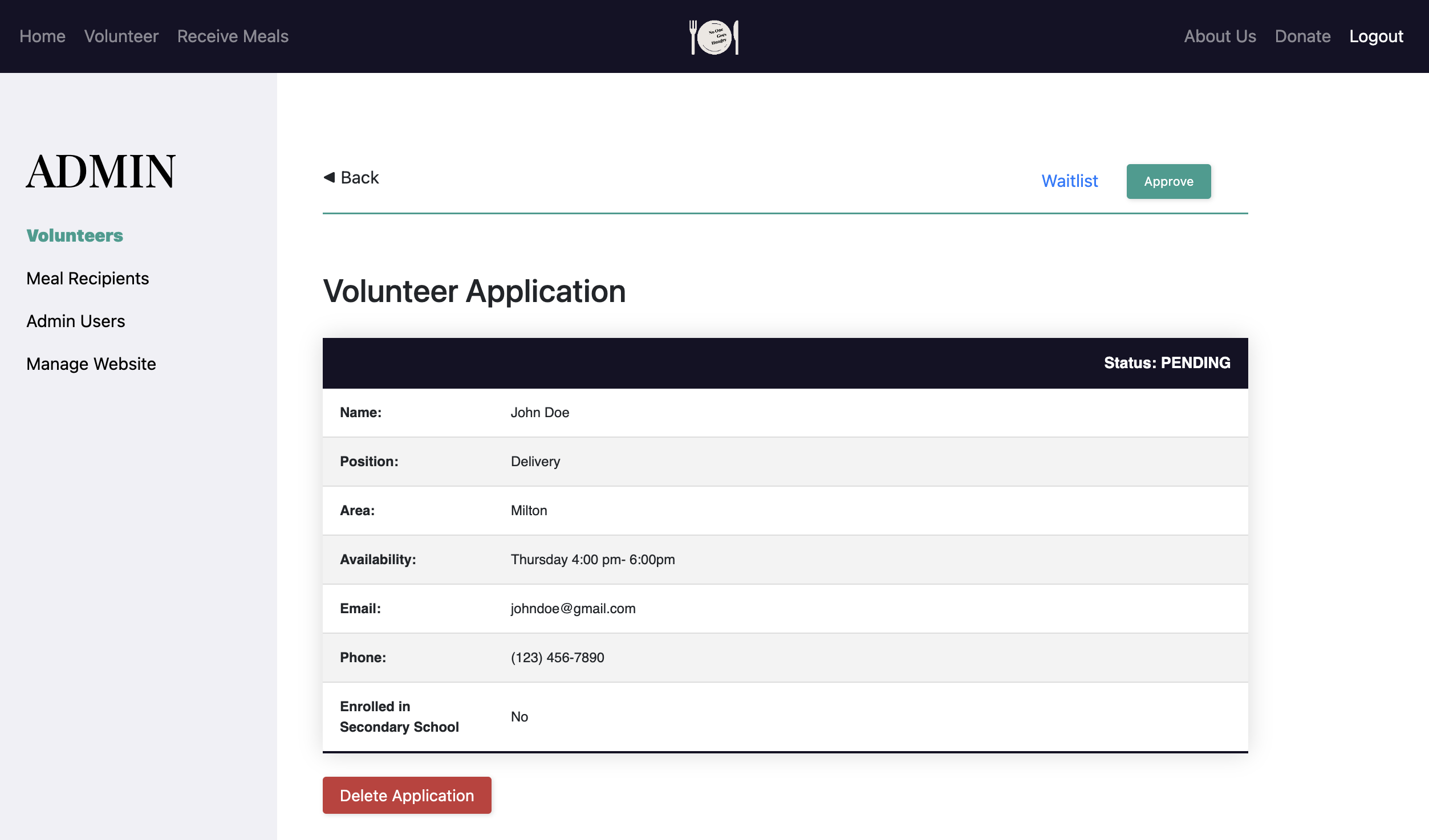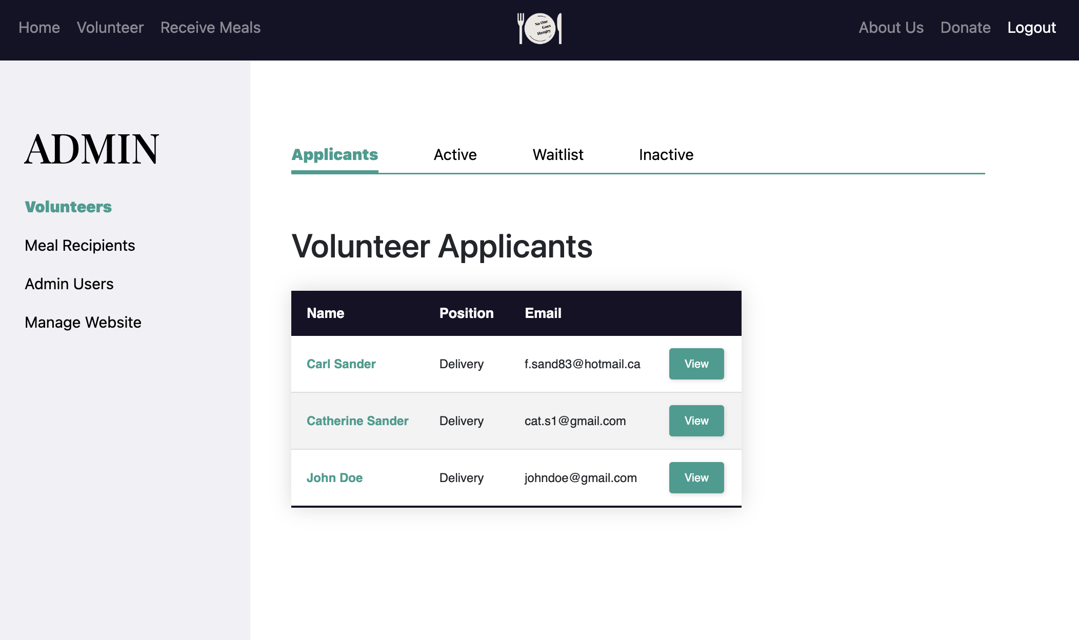 Once the management team is logged into the admin portal they are able to manage all applications, current volunteers & current meal recipients. To view all applications for Volunteers the admin would navigate to the Applicants tab at the top. On this page users can click to view a specific application. If the applicant meets the criteria the admin can approve the application.