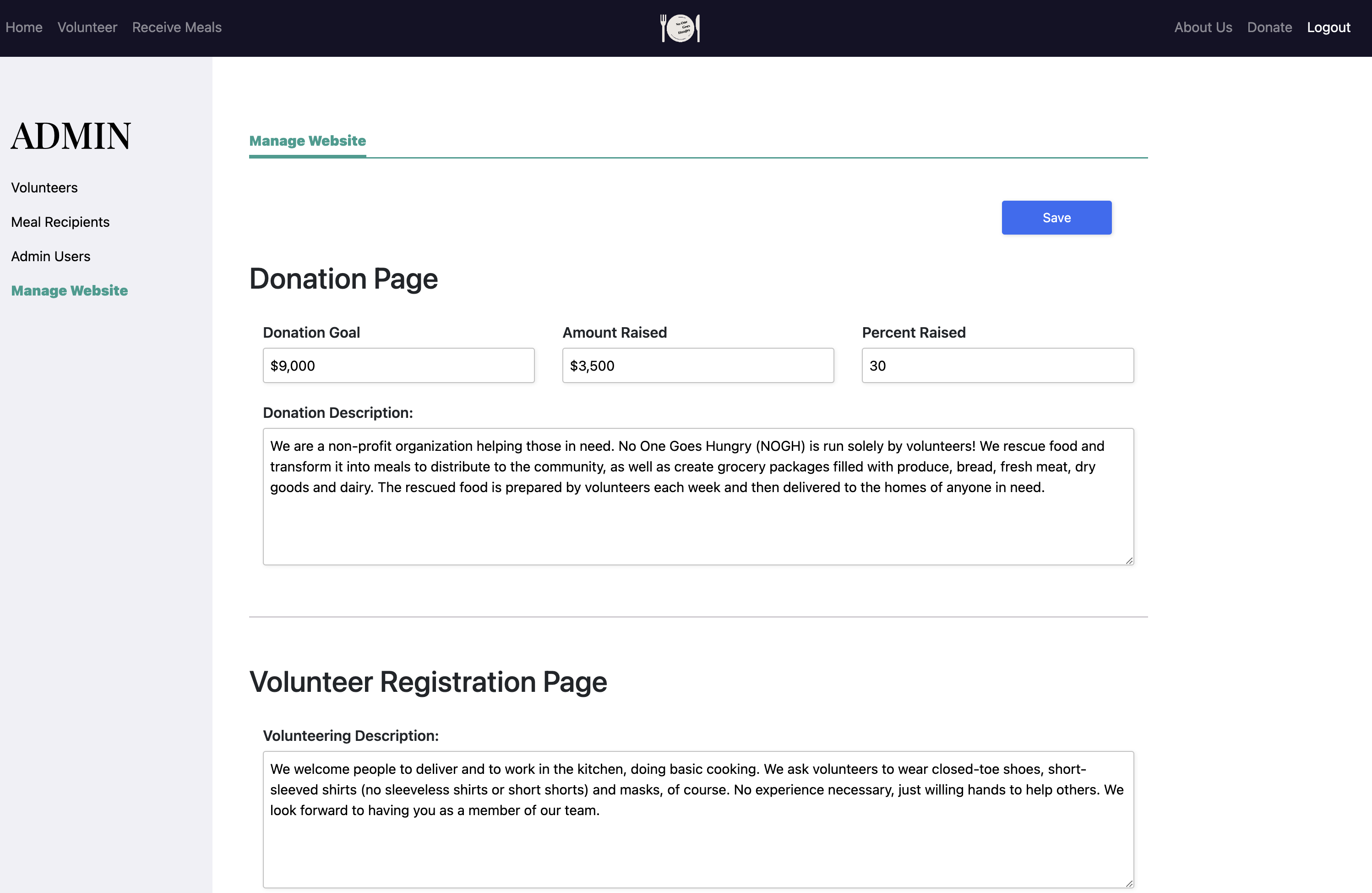 The admin portal is a secure portal where the management team can log in with their individualized credentials to manage the website, manage all admin users who have access to the portal, as well as manage applications and current volunteers & meal recipients.