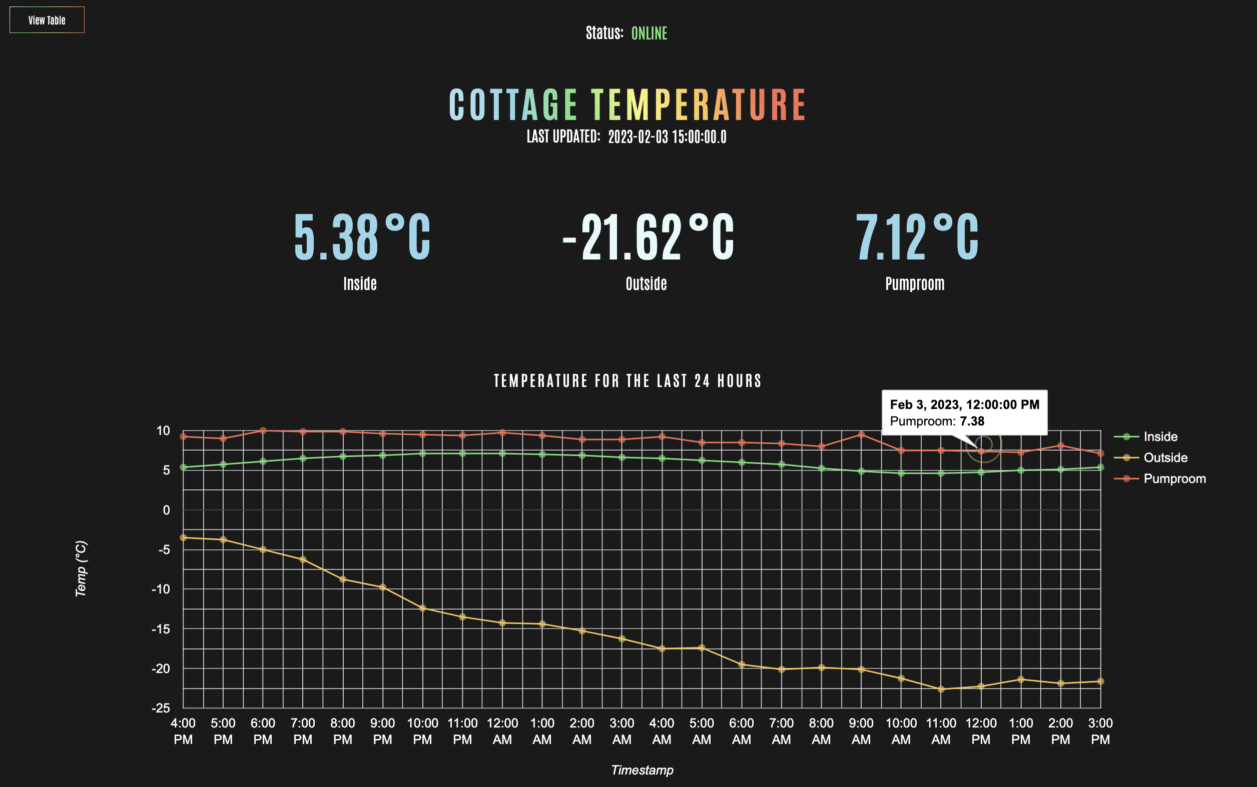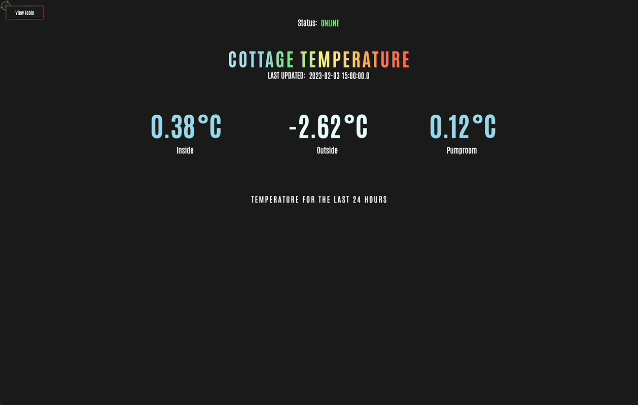 The website displays the status to indicate right away if the system is running and updating the temperatures every hour (if the power is on and the wifi is working). This website monitors three locations: Inside, outside, and the pumproom. The most recent temperature received for each location is displayed along with the time of the last update above it. The colour of each of the numbers is determined by how cold or hot the temperature is. Below the current temperatures there is a graph that displays the temperatures for the last 24 hours. There is also an option to switch to a table view of the data.